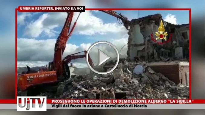 Prosegue lavoro demolizione albergo Sibilla di Castelluccio di Norcia Le operazioni di demolizione dell’albergo Sibilla di Castelluccio di Norcia, irreparabilmente danneggiato dal sisma, proseguono. I Vigili del fuoco, che possiamo vedere in azione nel video […]